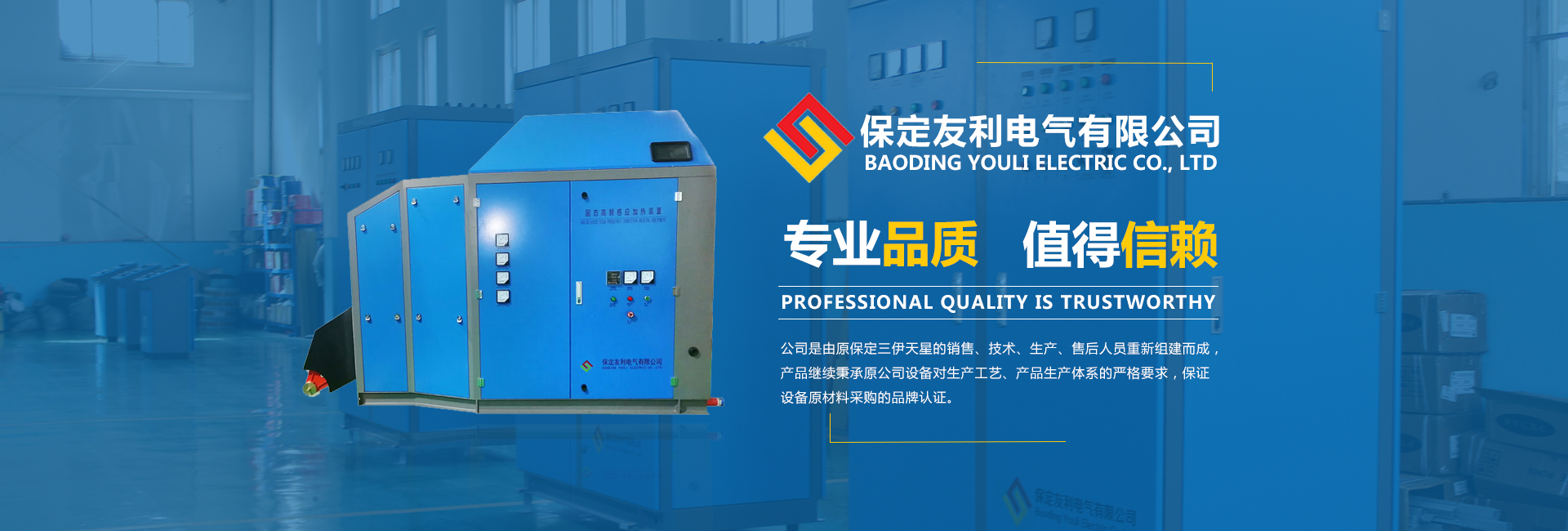 “保定友利電氣有限公司”成立于2020年5月,公司園區(qū)坐落在交通便利、環(huán)境優(yōu)美的保定國家高新技術(shù)產(chǎn)業(yè)開發(fā)區(qū)。由原“保定三伊天星”的銷售、技術(shù)、生產(chǎn)、售后人員重新組建而成,產(chǎn)品秉承并提升了原公司設(shè)備的生產(chǎn)工藝、對產(chǎn)品生產(chǎn)體系要求更加嚴(yán)格,保證設(shè)備原材料采購的品牌認證。 公司注重新產(chǎn)品的研發(fā)與應(yīng)用,自公司成立以來,先后與河北農(nóng)業(yè)大學(xué)機電院、河北大學(xué)電子信息工程學(xué)院-胡聰權(quán)教授、中科院電工研究所共同技術(shù)合作;第一、對原三伊設(shè)備進行了工藝和控制...